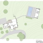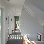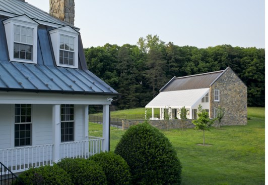 “The building took the most elemental form of the vernacular barn,” he adds. The simple gabled structure employs clean lines and minimalist detailing to emphasize its agricultural inspiration. A material palette borrowed from the existing farmhouse links the two structures. Local stone caps both ends in an abstract of twin stone chimneys on either end of the main house. Painted white wood siding and a copper roof complete the straightforward finishes. The ground floor glass doors are mirrored by similarly proportioned windows aligned exactly above. These matching windows and doors are set into circulation spines on both levels to encourage natural ventilation and daylighting. The swimming pool runs parallel to the house and is within a few inches of being the same width. “We tried to make it as reductive and simple as possible,” Fraerman says, “and the symmetry helps keep it simple.”