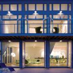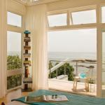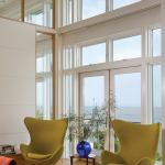 Up above, stacked windows, transoms, and French doors flood the second-floor interiors with natural light. The combination of high ceilings and abundant glazing provides panoramic coastline views and makes small spaces feel larger than they actually are.