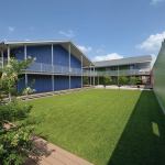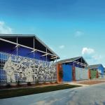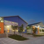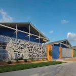 The new campus, designed by Glassman Shoemake Maldonado Architects and built by Camden Builders, achieves the seemingly impossible. It’s now home to 149 single-room–occupancy units for residents who make an average of $12,000 per year and pay rents ranging from $425 to $485 per month. Low-rise buildings are separated by public gardens containing a barbecue area, a croquet court, a fountain, and quiet courtyards. But the project’s sound mitigation strategy is the cleverest piece of all. Buffering the site from freeway noise is a public art display that runs the length of the property. It comprises four galvanized steel murals by Chicana artist Carmen Lomas Garza—crafted in the style of traditional Mexican papel picado (paper cut-out) banners—combined with colorful masonry walls. This vibrant display is complemented by clerestory stained glass mosaic windows, celebrating local Hispanic heritage and culture.