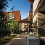 Public spaces are the organizing framework for this 4.78-acre village, which layers upscale townhomes, flats, live/work units, and retail in a neighborly setting. Buildings oriented for shade protection form a sequence of interconnected outdoor “rooms” with sightlines to the mountains and an adjacent canal promenade.