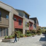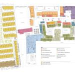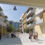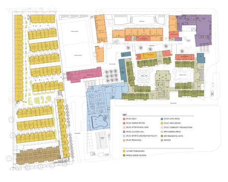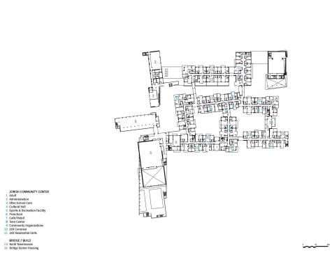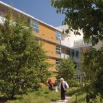 “We took half the buildings and cocked them about 7 ½ degrees, while leaving the rest of the buildings at 90 degrees,” Steinberg says. “That minor adjustment created outdoor spaces that were orthogonal rather than rectilinear, [and] intersections that are friendly, with lots of nooks and crannies filled with benches and oversized planters to facilitate connections. We wanted this to be a place where unprogrammed social interaction was as important as the programmed.” And where older generations have the opportunity to be in the thick of things.