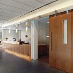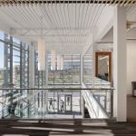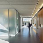 The building also includes a high-performance ventilated wall system that clads an air space with a skin of polycarbonate board in some places and with Italian porcelain tile on the exterior walls on the most visible sides of the building.