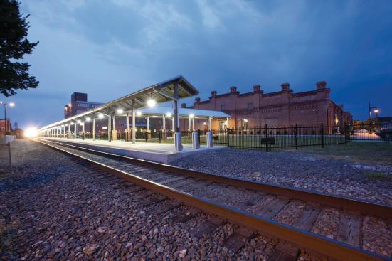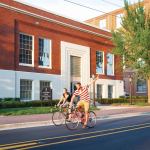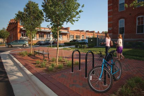 Eco-friendly in its adaptive reuse of existing structures and proximity to public transit (the site abuts Durham’s Amtrak station), the project is also thoughtful in its landscaping. Exterior courtyards connecting the buildings provide greenery and usable outdoor space, while simultaneously housing bio-retention cells with vegetative sand filters and a recirculating rainwater collection system.