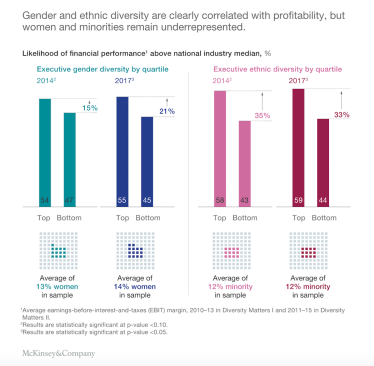 Our research confirms that gender, ethnic, and cultural diversity, particularly within executive teams, continue to be correlated to financial performance across multiple countries worldwide. In our 2015 report, our hypotheses about what drives this correlation were that more diverse companies are better able to attract top talent; to improve their customer orientation, employee satisfaction, and decision making; and to secure their license to operate—all of which we believe continue to be relevant.