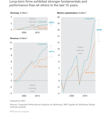 In a Harvard Business Review piece, former United States Secretary of the Treasury and current Harvard professor and president emeritus of the university Larry Summers, looks at new McKinsey research that contrasts the performance of public companies who manage for short term [earnings], vs. those whose strategists manage for the long term.