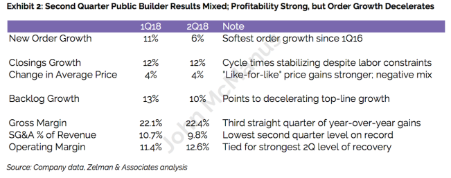 They note that the Zelman home builder basket had a great quarter from a business operating margin and profitability standpoint, but appear to have reached a pivotal moment in terms of the sustainability of their sales volumes and margins. The report takes particular note of new order growth of 6% across the 14 companies analyzed, a 500-basis point quarter-to-quarter decrease in sales volume growth from the first quarter of 2018: