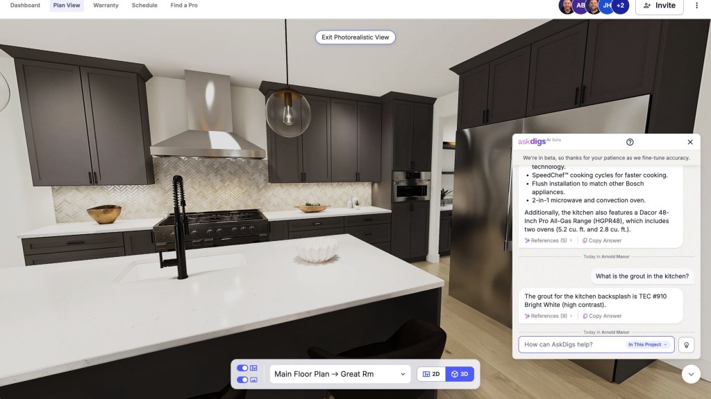 Digs AI generates 3D models of a home plan, renderings, and answer questions instantly for both build teams and homeowners. The platform has almost 10,000 homes and builders are leveraging it to reduce errors, streamline process, and collaborate on pre-construction to handoff and warranty.
