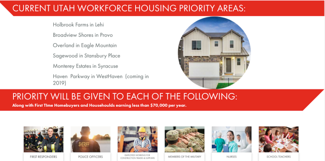 Those on the Utah Workforce Housing Priority list will be given preference for more than 150 lots in 19 different cities that will be available this year. In addition to priority access to these homes, Ivory Homes will also be providing landscaping and giving $2,000 towards closing costs or options, such as washer and dryer, refrigerator, window coverings.