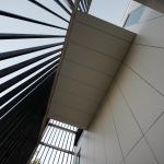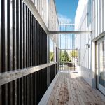 A wooden screen shields outdoor decks from nearby traffic noise … A wooden screen shields outdoor decks from nearby traffic noise while framing the light that enters the living units.