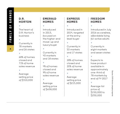 Today, Emerald’s traction is with well-heeled buyers who are in the market more for features and design that speak to attainable aspiration, rather than the self-indulgence-without-a-second-thought super-elite buyer some of the luxury competitors serve. Emerald is in 43 of the 78 total D.R. Horton markets, and in 18 of the 26 Horton states, accounting for about 4% of total sales and 9% of the company’s $12.6 billion in 2016 home building revenue.