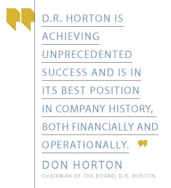 “We have captured industry-leading market share by responding to the needs and wants of America’s home buyers and by introducing new brands to our product line,” explains Don Horton, who founded the company in 1978 and took it public in 1992. “With a solid team, strong lot position, and the flexibility to cater our offerings to a diverse customer base, D.R. Horton is achieving unprecedented success and is in its best position in company history, both financially and operationally.”