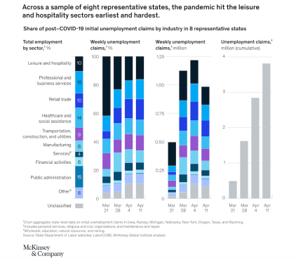 “Demand shocks have been reverberating through all sectors. Now that pandemic-related unemployment claims have been pouring in for several weeks, the losses associated with the initial shutdown are cascading into knock-on effects. While leisure and hospitality accounted for most of the earliest layoffs and furloughs, the share from industries such as retail trade, manufacturing, nonessential healthcare, and professional services has been growing. We estimate that up to 57 million US jobs are now vulnerable, including more and more white-collar positions. By way of context, some 59 million jobs are at risk in the European Union, the United Kingdom, and Switzerland, which have a considerably larger population.