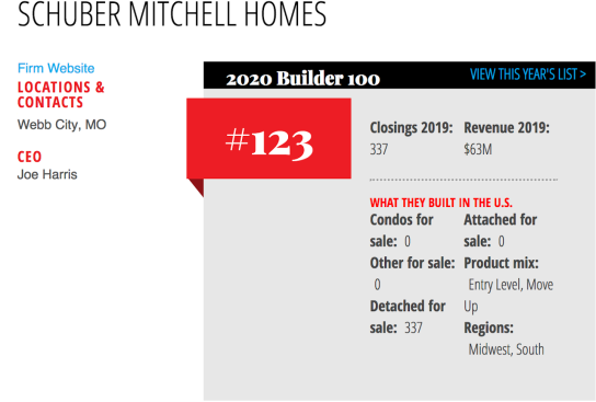 While many of these hallmarks of success–culture, product, positioning, pricing, etc.–show up among Schuber Mitchell peers up and down the Builder 100 rankings, a fifth really drives a wedge of difference between this Southwest Missouri/Northwest Arkansas builder and most of the builders thriving in the top-most and second-tier home building markets throughout the US.