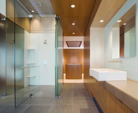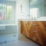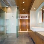 This elegantly restrained bath—part of a master suite transplant for a 1980s spec house—turned the existing bathroom into what architect David Jameson calls a “teak pavilion.”