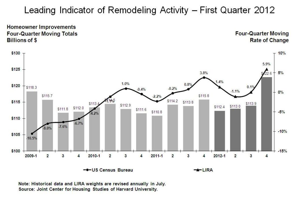 According to the quarterly Leading Indicator of Remodeling Activity (LIRA) released by Harvard’s Joint Center for Housing Studies (JCHS), the home remodeling market is predicted to pick up steadily throughout the rest of the year. Although residential remodeling didn’t suffer as much as new construction throughout the downturn, it fell considerably in 2009 and has shown only minor up and down fluctuations over the past two years. LIRA analysts predict that trend to change throughout the remainder of this year with an expected 5.9 percent increase for the fourth quarter of 2012.Eric S. Belsky, managing director of JCHS, credits the improvement to stronger home sales and continued low interest rates. Belsky also remains optimistic about future LIRA forecasts. “Hopefully,” he says in the report, “we’re finally moving beyond simple volatility in the home improvement spending numbers to a period of sustained growth.”