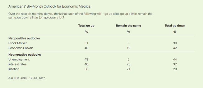 “Americans are concerned about the present state of the economy and believe conditions are worsening, but their six-month predictions for specific aspects of the economy are less dire — particularly in terms of the stock market and economic growth.”