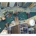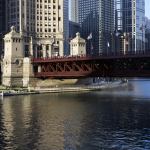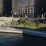 The design varies the experience with “rooms” between the bridges, and there are destinations to draw people down to the river. The Wabash Memorial Plaza (pictured) is a focal point, providing a landscaped refuge and linking Wacker Drive to the riverfront development. The Vietnam Veterans Memorial Fountain on the plaza is a wall of water that cuts into the limestone and spills into a pool. A timeline of significant events during the war and the names of Illinois soldiers who died line the sides of the pool.