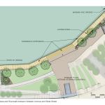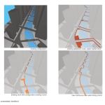 New canopies positioned on the underside of bridges protect pedestrians from falling debris. Their concave shape creates a natural reflector that catches light from the water. Where they can be touched, the metal tiles forming the canopy are sanded for pedestrian safety and easy maintenance. At higher levels, tiles are polished and reflect the water. New railings cantilever at the river’s edge so that water seems to lap under the path. Where the path veers from the edge, it is lined with boulders and plantings.