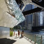 Ross Barney Architects • Main Branch Riverwalk is a series of open, paved plazas and landscaped parks connected by river-level paths from Chicago’s urban core to Lake Michigan. The concept is to create an uninterrupted pedestrian circulation route near the water, separated from automobile traffic on the upper level of Wacker Drive.