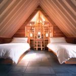 A pair of twin beds in the guest room frames a delicate wooden stair leading to a loft.