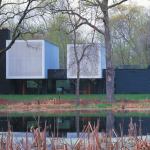 Sited on a bluff overlooking the Mississippi River, the Albrecht Residence is a cubist modern building wedged between two bookends with steeply pitched roofs.