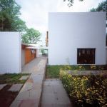Four boxlike structures–three garages and a workshop–stand sentry duty between the parking area and the entry court.