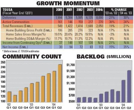 If second quarter 2004 earnings are an indication, they won’t have to wait long. TOUSA has reaffirmed its 2004 objectives to deliver total revenue and net income growth of 21 percent and 35 percent, respectively, on 8,000 home closings (up from 6,135 in 2003). And at the second quarter’s end, TOUSA reported a 68 percent increase in net new sales contracts and 87 percent increase in sales backlog on a dollar volume basis, excluding joint ventures.