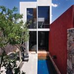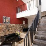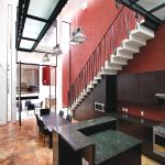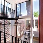 Made with local labor and materials, interiors feature travertine floors, a continuous red accent wall, steel railings, whitewashed surfaces, and an old stone wall.