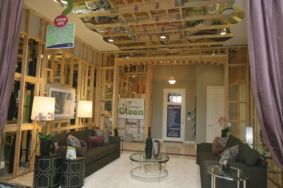 To slash energy consumption, Meritage super-insulates its houses with spray foam, after building a framing system that provides unbroken insulation in the walls by staggering the exterior and interior framing. Then it installs a solar-electric panel system that offers four times more BTUs than a typical solar system by capturing more heat from the solar panels to heat water and to heat and cool the houses. In addition, the 2100 ECHO Solar Electric/Solar Thermal system manages fresh air transfer into the house.