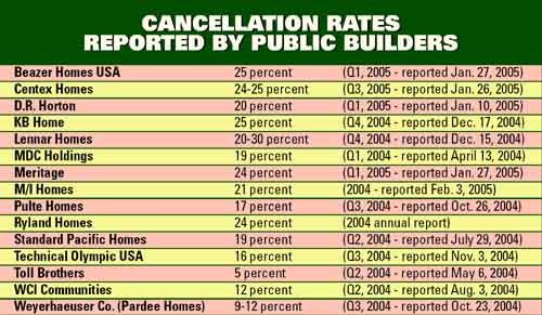 The Securities and Exchange Commission doesn’t legally require public builders to report cancellations in corporate accounting, so no standards for the data exist. Some companies specify to a tenth of a percentage point from quarter to quarter, others report a 10-point spread or such vague assessments as “the low end of the normal range” or “a drop of 300 bps (basis points) year over year.” Even then, only when analysts ask point blank for data do executives yield the information. Often, the answer is that “it all depends.”