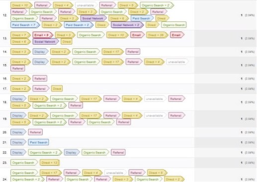 Look at line 12 above, as a real-life home builder example. This particular home buyer visited 39 times via multiple channels including organic, direct, social, paid search and referral, before converting.