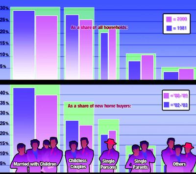 BACK FOR SECONDS For all the talk about the increase in people living alone, in single-parent families, and in the hodgepodge of other household types, these households have not increased their share of new home buyers by that much over the past 15 years. People living alone as a share of new home buyers increased from 12 percent in 1988-1989 to 14 percent in 2002-2003, while the single-parent share fell 1 percent to 6 percent, and the “other” household share held firm at 8 percent.