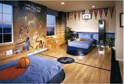 IN A CROWDED BUILDING MARKET, how do you make people remember your homes over the next guy’s? For Denver-based Berkeley Homes, it all comes down to the “basketball room” in the Presidio plan, in the Reunion master planned community north of town. Tying into Reunion’s spacious rec center, Berkeley combined two children’s bedrooms into one shared bedroom for two little boys, making it a scale model of a basketball gymnasium, complete with bleachers and a three-point shooting line on the floor.