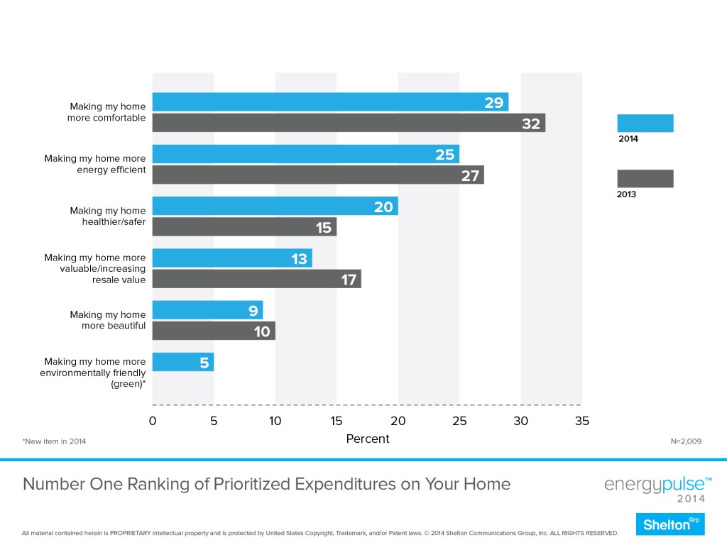 Comfort: In this year’s Energy Pulse survey, when we ask Americans to prioritize comfort, efficiency, health, resale value, beauty and green, in terms of expenditures, comfort wins. It makes sense: the notion of being able to wrap my family in a big, warm, fuzzy blanket and keep them cozy offers a much stronger emotional pull than saving a few bucks on my energy bill. And, by the way, in other questions when we try to get at aesthetics vs. efficiency, of course the reality is that people want pretty homes…but they also want pretty, comfortable, high-quality homes. They don’t see efficiency and aesthetics as two separate silos the way our industry does. They see those as hallmarks of quality homes. So don’t separate them. Talk about having better homes and better products, and use comfort and beauty as the proof points to that better claim.