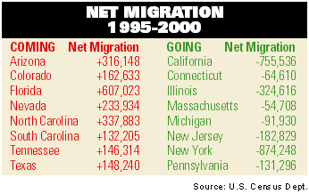 For the first time, net migration numbers for California were negative, meaning more people left the state than moved there. However, new immigrants and births have kept the state’s growth steady. According to a report issued in August from the U.S. Census Bureau, 2,204,500 Californians left the state from 1995 to 2000. The state’s net migration figure for the period is a negative 755,536.