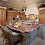 • PLUMBING FIXTURES & FITTINGS. The big island is home to a trio of sinks and accompanying faucets by Kohler Co. (circle no. 169). The main sink, across from the range, displays a farmhouse look. It’s supplemented by the company’s 33-inch, stainless-steel trough sink for food prep purposes and, on the end of the island, a PRO CookSink that not only allows you to fill a pot with water from the adjacent faucet, but heat it up in place instead of dragging it to the stovetop. Kohler’s HiRise pot filler faucet along the range’s backsplash does similar duty.