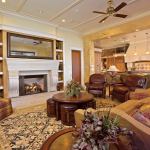 Savvy architects and builders know where their bread is buttered: in the kitchen, especially in one that is connected none-too-subtly to a comfortable gathering area and to the outdoors. This one doesn’t disappoint on any score, offering a generous, L-shaped room, anchored by a massive, granite-topped island, that flows to a casual family room and through neat, sliding glass pocket patio doors to the loggia. Oh, and there’s also a pair of terrace doors directly from the kitchen to the pool as an alternative route to the outside. Unlike the parlor, the family room features both the traditional hearth of a wide fireplace and the modern one of a flat-screen TV set in a cabinet along the stair wall. The room offers three escapes besides the patio doors to the loggia: one to the three-car garage; one to the motor court (in which a clever dog house and closet occupy the understair space); and one through a short passage past the elevator to the single-car garage/ workshop. And, for convenience, there’s a full bath just around the corner that shares duties for the pool, loggia, family room, and guest suite.