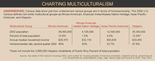 Once in the United States, people of all cultures want a home of their own. Homeownership rates for non-white groups are significantly below those for whites, but it is not from lack of desire. Second-quarter 2002 Census data reported non-Hispanic white homeownership at 74.3 percent. Forty-eight percent of blacks, 47.6 percent of Hispanics, and 53.7 percent of Asian-Americans own homes.