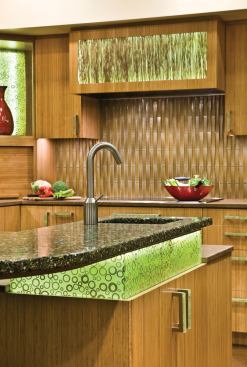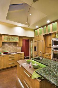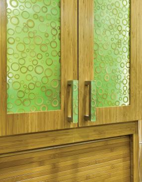 It may come as no surprise that the client’s favorite color is kiwi green, but this kitchen’s palette is green in more ways than one. High-efficiency lighting and appliances notwithstanding, interior designer Leslie Lamarre also specified a host of eco-friendly finishes, including LED lighting, FSC-certified Plyboo cabinets, Ecoresin cabinet panels embedded with bamboo rings and thatch, cork tile flooring, and a silica tile backsplash. The countertops along the walls are Fireclay “bottlestone,” a material made with 80 percent post-consumer recycled glass. And the island countertop is Vetrazzo, a similar product made with recycled glass derived from curbside recycling programs. Continuing the no waste mantra, the cabinet and drawer pulls were fashioned out of leftover Ecoresin scraps.