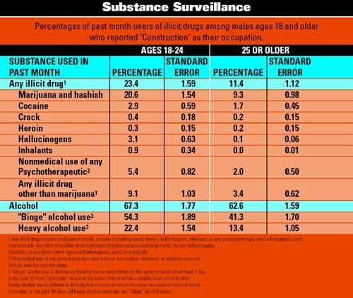A study by the U.S. Department of Health and Human Services office of Substance Abuse and Mental Health Services Administration (SAMHSA) reports that, when examining workers ages 18 to 49 by occupation and industry categorization, construction fell among the industry categories with the highest estimated number of current illicit drug and heavy alcohol users. Their research has shown that while an average of 10 percent of employees in any U.S. workplace abuse drugs, the construction industry numbers greatly exceed that, ranging from 12 percent to 20 percent in some areas.