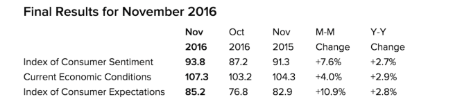 Likewise, the University of Michigan measure of consumer moods–the Sentiment Index--showed similar strength during the month of November, perhaps a reflection of an American psyche that got a lift from either or both the outcome of the Presidential election, or the mere fact that it was finally done.