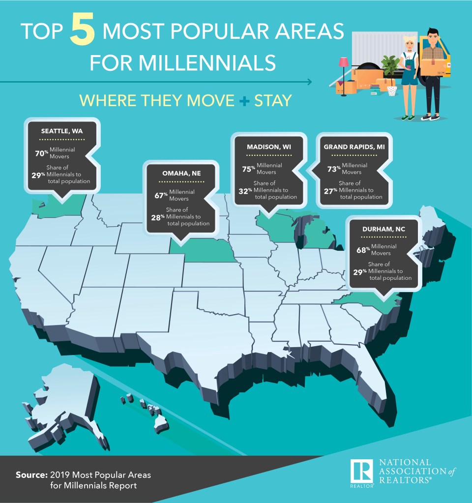 The National Association of Realtors®’ was out Thursday with its 2019 report, “Most Popular Areas for Millennials: where they move and stay.”