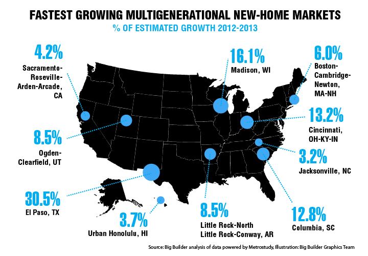 Here’s how we got our map. For the top 10 growing multi-generational markets, first, we started rankings from the top 100 markets for new-home closings in 2013, powered by Metrostudy Builder Insight. Then, we calculated the percent of new homes sold to three or more adults of all new homes sold with demographic data. Finally, the markets are ranked by the percent growth in closings to households of three or more adults between 2012 and 2013.