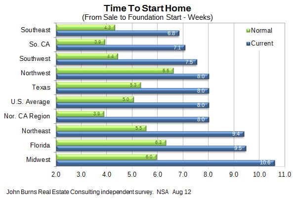 While the problem isnât ubiquitous, it has already begun to impact the time it takes to start and finish homes. A survey of builders by JBREC shows that the average time it takes to start a home across the country is eight weeks, three weeks longer than the typical average of five, says Kahn. The time itâs taking to complete a home, from start to finish, has climbed from four months to 4.3 months.