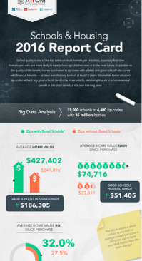 ATTOM Data Solutions (the new parent company of RealtyTrac), the nation’s leading source for comprehensive housing data, released its 2016 Schools and Housing Report, which shows that homes in zip codes with at least one good elementary school have higher values and stronger home price appreciation over the long term than homes in zip codes without any good elementary schools.