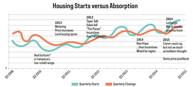There is a problem with that, however, and it is land. Builders are running low on finished lots, owing to the time-lag between land entitlement and breaking ground. As Crowe explains, it takes four years or more to complete that process, and four years ago, lot acquisition was still mired in the downturn. He says he does see a gradual improvement in supply in 2016 and beyond.