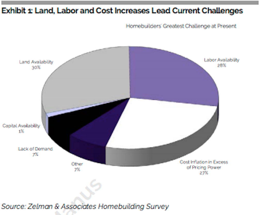 Ivy Zelman and her team of analysts at Zelman & Associates confirm that, in a ranking of challenges in order of the grief they cause, builders list “land availability” as the No. 1 worry in Zelman’s private home builder universe, with labor availability a close second.