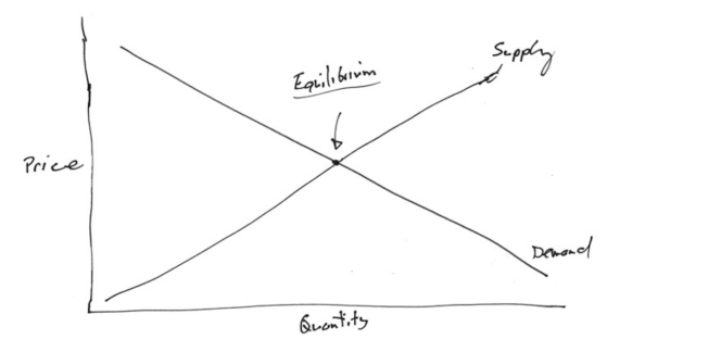 There are two assumptions you can make based on this chart. The first is still more or less true today: as demand for a product goes up, supply increases, and price goes down. If the price gets too high, demand falls. The sweet spot where the two lines intersect is called equilibrium. Equilibrium is magical, because it maximizes value to society. Goods are affordable, plentiful, and profitable. Everyone wins.