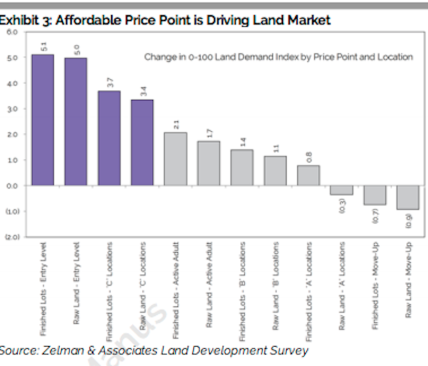 “Our overall land demand index was 0.6 points higher versus this time last year, led by entry-level finished lots (up 5.1 points), entry-level raw land (up 5.0 points) and finished lots in affordable C locations (up 3.7 points). Similary our index tracking the development of raw land reached 64.8 in 3Q16, another peak for this cycle.”
