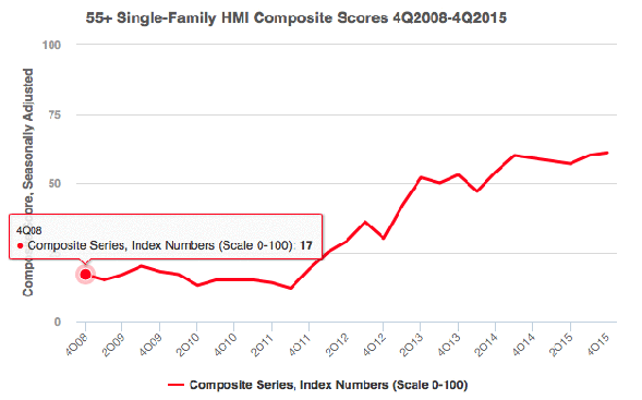 But this month, next month, and solidly for the next 24 to 36 months ahead, it’s what happens in the 55+ market that will make or break most of the new-home players, based on their ability to meet that under-served need. The home builders who are already all-in on this game are optimistic, as the 2015 Q4 NAHB 55+ Housing Market Index survey shows.